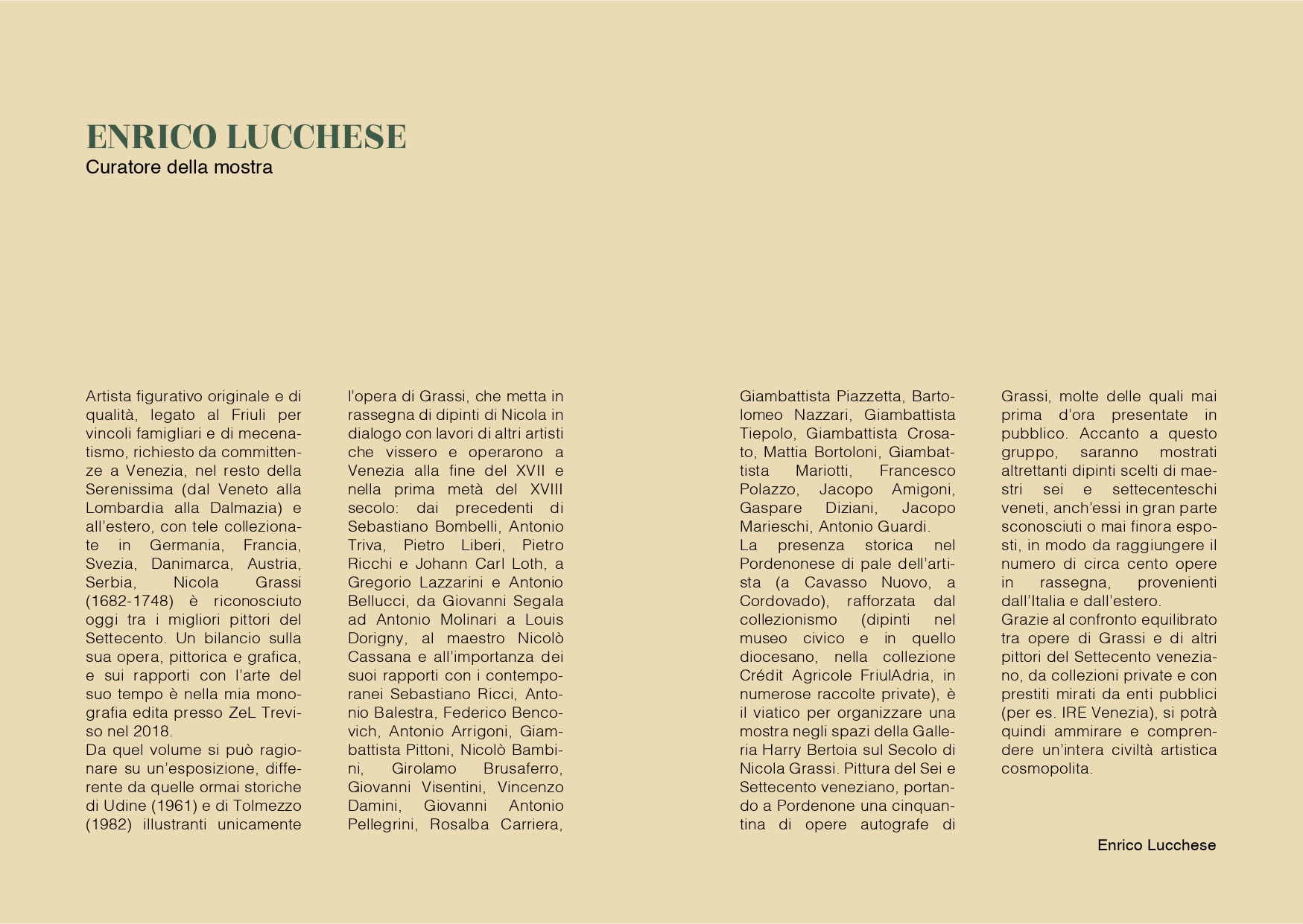 Il progetto espositivo esibisce principalmente alcune delle opere di Nicola Grassi, ma anche numerosi dipinti di autori del settecento veneziano, creando un ulteriore legame con la città di Venezia, alla quale siamo uniti da un protocollo di collaborazione culturale ed artistica.